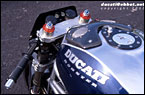 At the front the fork legs have been swapped for fully adjustable and more stable Ducati 996 items, kitted with Ohlins springs and oil. A set of custom made ISR racing triple clamps, reducing flex to a minimum and improving the feel for the front suspension, holds the new fork legs in place.